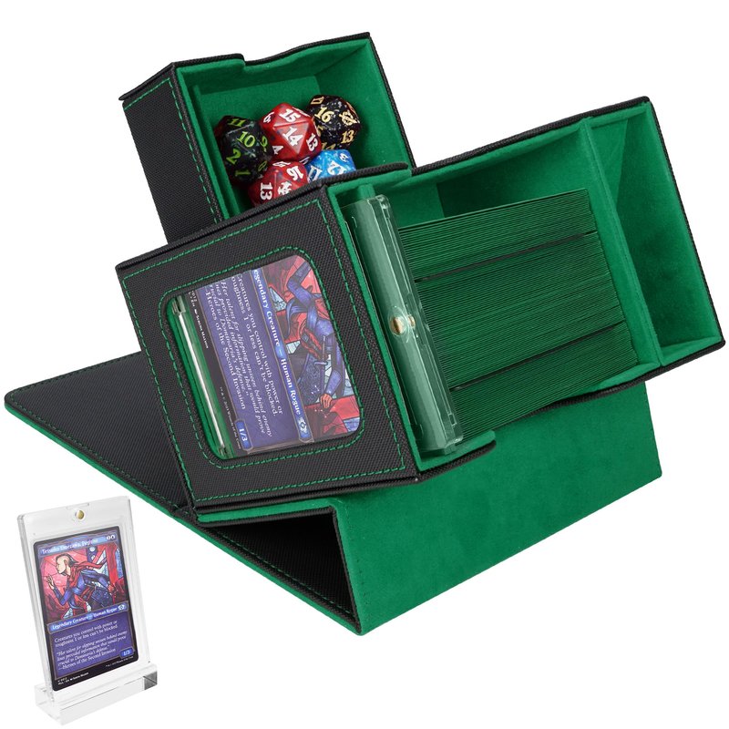 AFIING MTG Deck Box for Commander Display,Card Deck box Fit 100 Double-Sleeved Cards,MTG Card Storage Box with 35pt Magnetic Card Brick and Dice Tray with Dice Tower(Black/Dark Green)