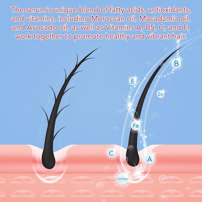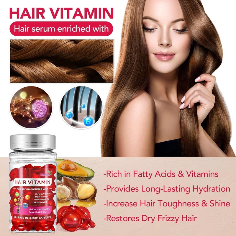 - Hydrate and Strengthen : Our Hair Vitamin Capsules are a concentrated leave-in serumenriched with avocado, macadamia, and moroccan oil,and vitamins A, B5, C, and E, to support damaged hair repair,reduce frizz and breakage,make your hair softer and stronger.
