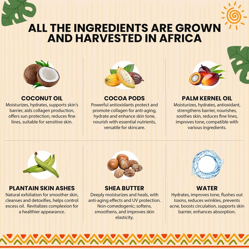 Ingredients: Extra Virgin Coconut Oil, Raw Cocoa Pods, Unrefined Palm Kernel Oil, Plantain Skin Ashes, Unrefined Shea butter, Purified Water and Vitamin E.