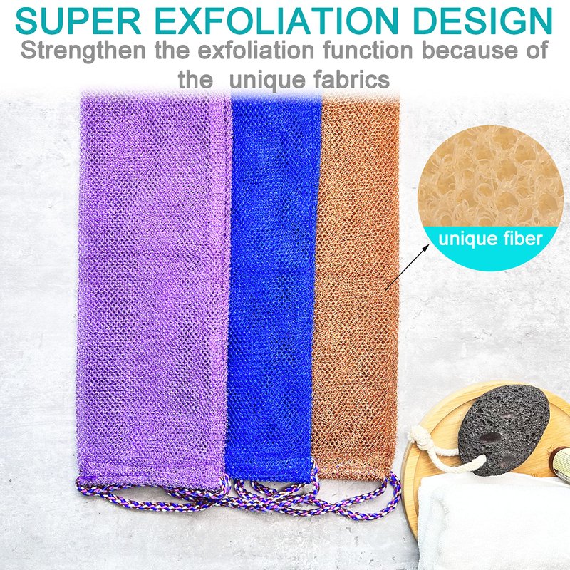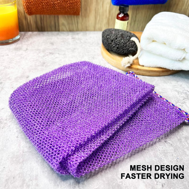 - MODERN DESIGN: exfoliating back scrubber, intended for cleaning the back, neck, shoulders, feet or any other hard to reach areas.Double Sided Available. Luxury bath and shower cloth with gentle body exfoliating and scrubbing power remove dead skin cells, for both men and women