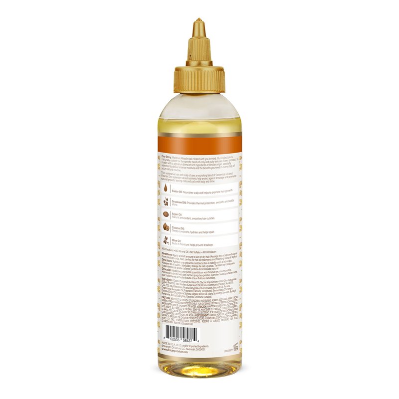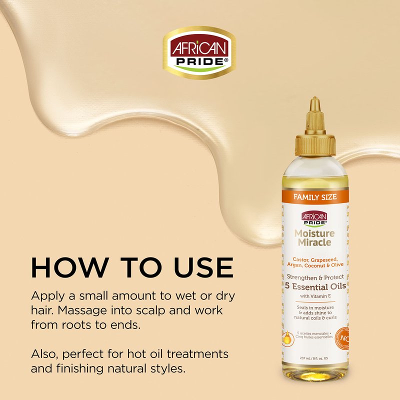 - PROVEN HAIR CARE - The restoring African Pride Moisture Miracle 5 Essential Oils treatment moisturizes the hair & scalp using a nourishing blend of essential oils & Vitamin E to replenish natural nutrients, prevent breakage & promote natural growth.