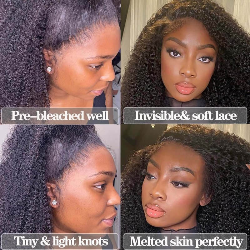 - Tiny knots bleached knots: The curly wig is pre bleached pre plucked human hair wig, tiny knots give very natural fake scalp look, invisible lace will melt with your skin very easily.