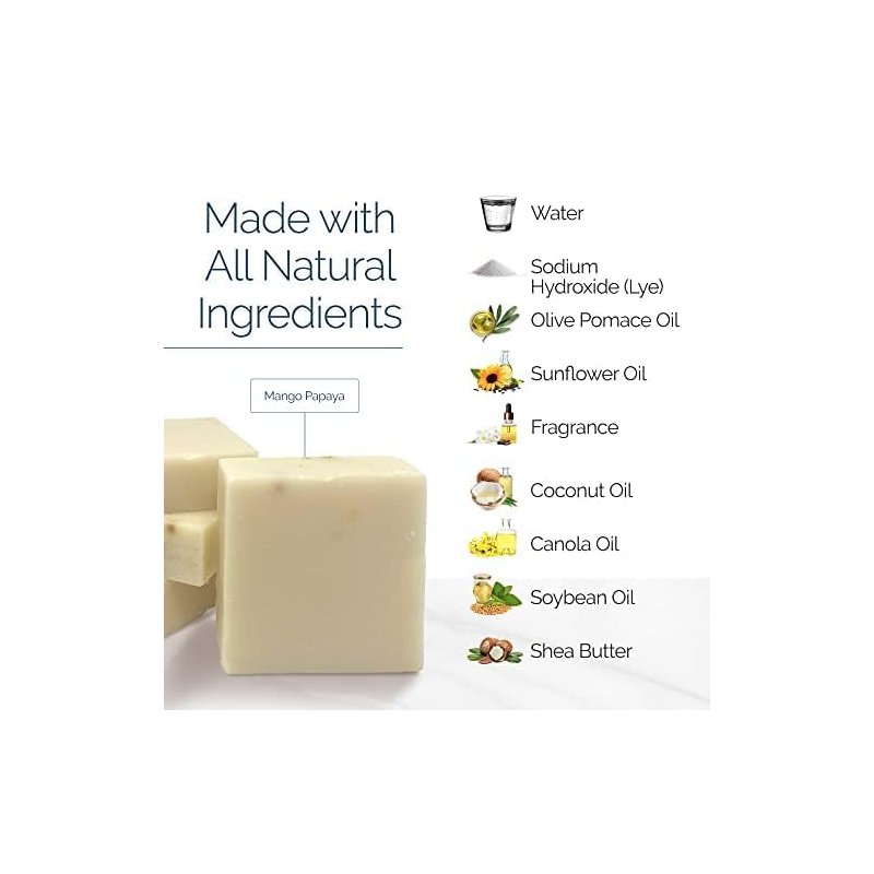 - 🚿 COLD PRESSED ARTISAN SOAP: Stay fresh and find pleasure with our Mango Papaya scented Cold Pressed Artisan Soap. We employ the cold process soap making method mixed by hand in small batches to ensure the quality of the product.