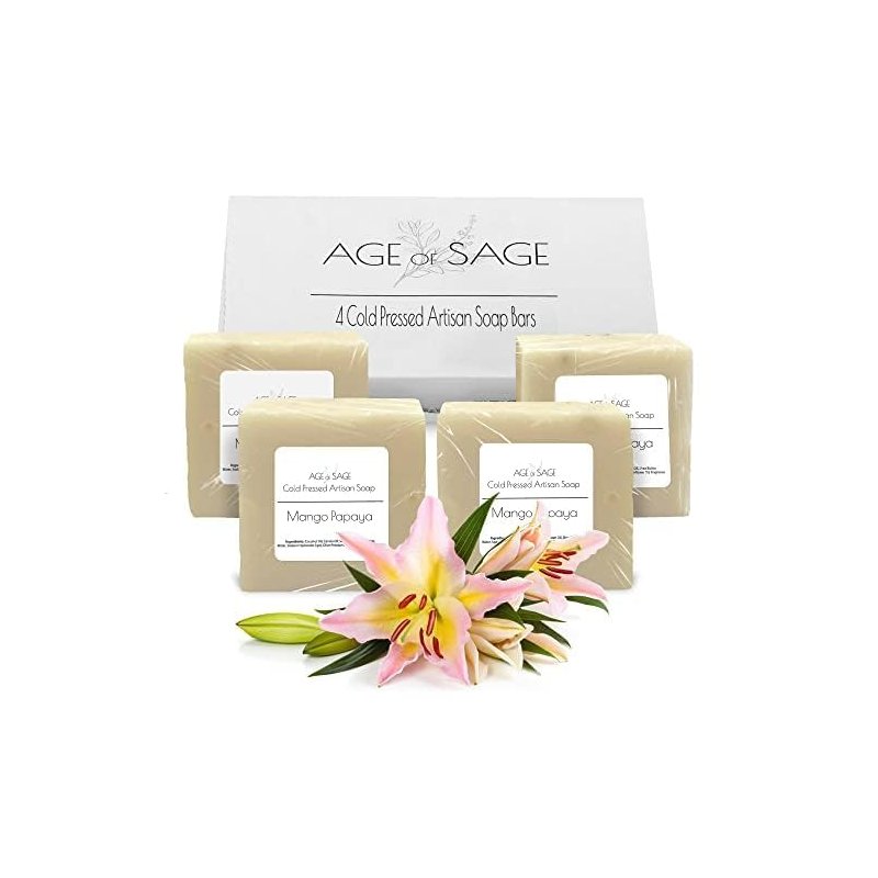 Age of Sage Handmade Natural Bar Soap Gift Set - 100% All Organic Vegan Bath Moisturizing Handmade Artisan Scented Cold Process Fragrant Soaps with Essential Oil - 4 Pack (Mango Papaya)