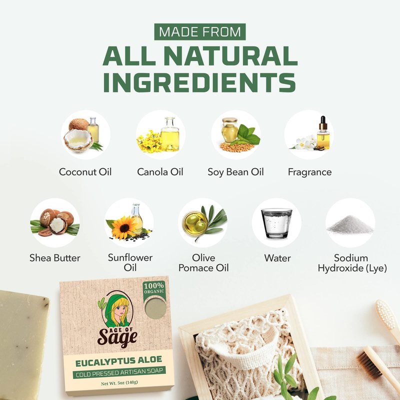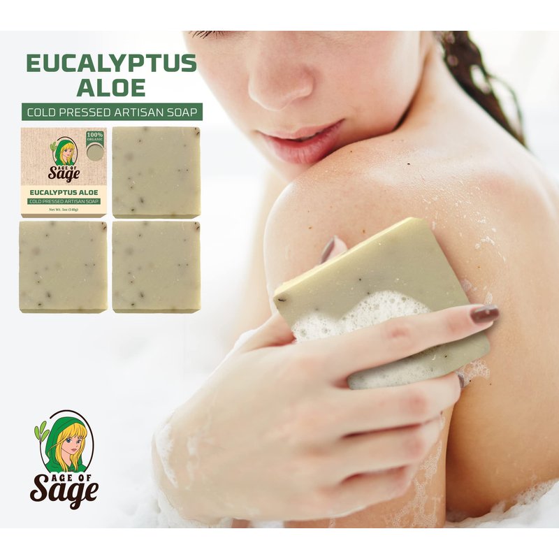 - WOMEN'S SOAP BAR EUCALYPTUS ALOE SCENT: Rejuvenate your mind, body, and soul as Age of Sage lets you feel an excellent bathing shower experience with its Handmade Eucalyptus Aloe Scent women's bar soap. Each body bar soap is made with a distinctive natural soap for women or a Eucalyptus Aloe-inspired fragrance that cleanses your skin while keeping it moisturized and nourished.