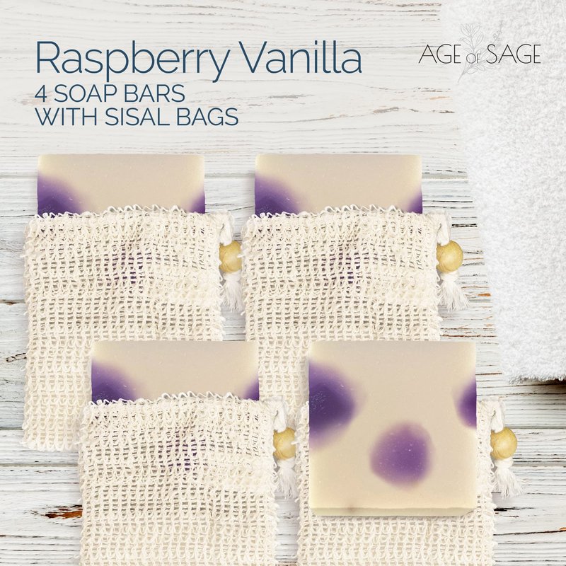 Age of Sage Natural Soap Bar w/Sisal Bag, Vegan Artisan Soap Bar Set for Women, Body Soap in Bar Soap Pouch, Natural Bath Soaps w/Essential Oils, 4 Plain Body Soap Bars, Raspberry Vanilla