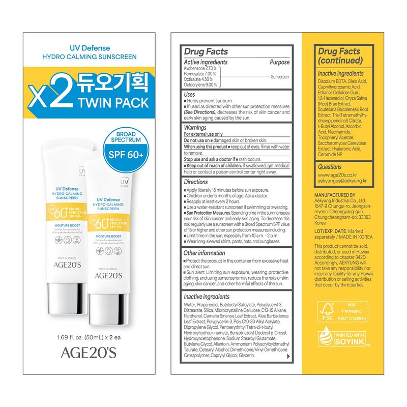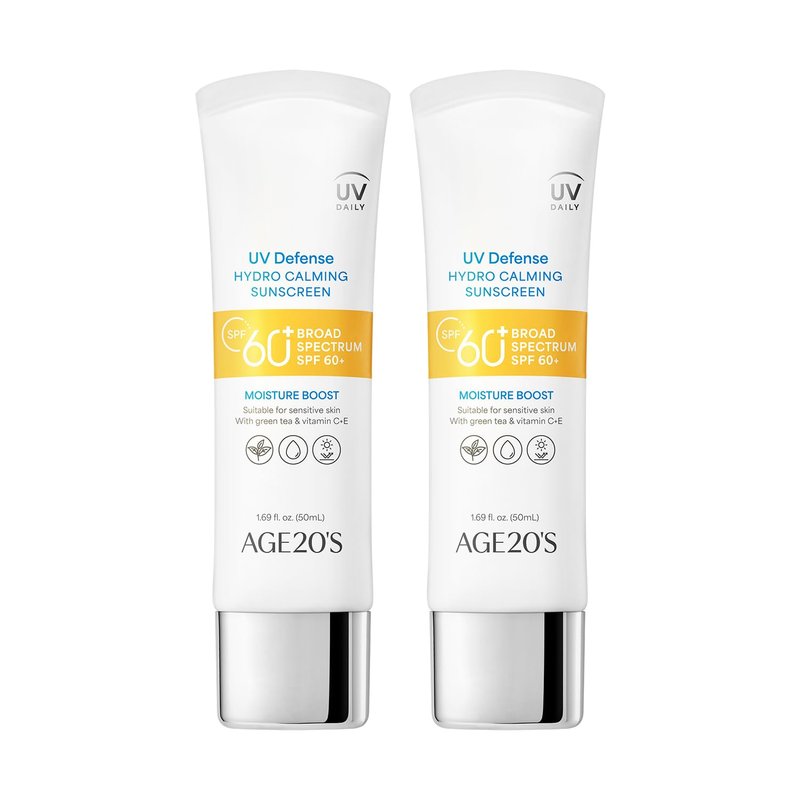 AGE20'S UV Defense Hydro Sunscreen SPF 60+ | Moisturizing Creamy Formula, No White Cast, Lightweight Finish | Green Tea + Aloe Vera + Vitamin C | Dermatest Excellent | Twin Pack 1.69 fl.oz*2