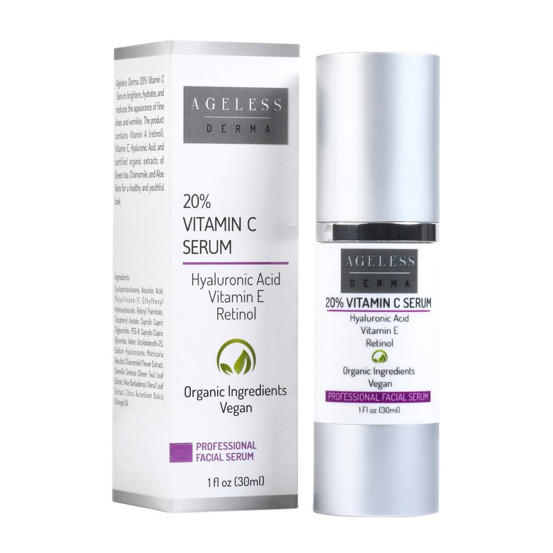 - Ageless Derma 20% Vitamin C Serum contains vitamin A (retinol), Vitamin E, hyaluronic acid, and certified organic extracts of green tea, chamomile, and aloe Vera for a healthy and youthful look.