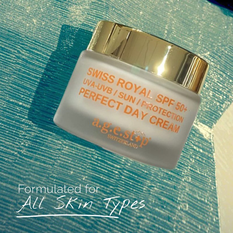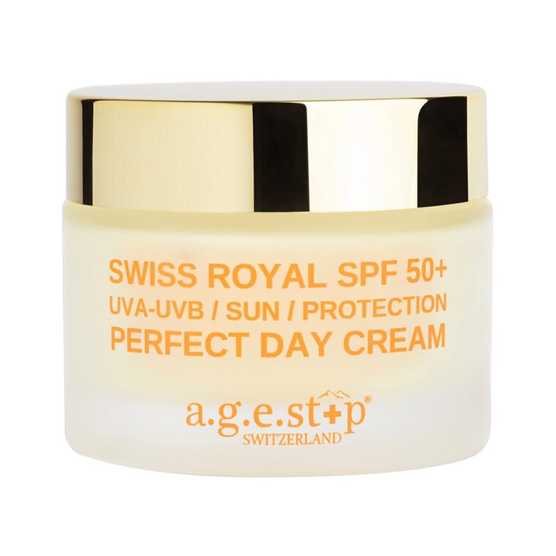 Swiss Royal Spf 50+ Perfect Day Cream is a powerful active sunscreen - protecting against UVA and UVB rays. An exclusive Swiss anti-pollution Complex - SunActin, Vitamin C and Royal Epigen P5 Peptide help to neutralize free radical pollution. With Omega rich Oleic Acid, powerful skin defence molecule & hydrator ECTOIN, repairing Bifida Ferment Lysate, and a precious selection of protective Argan, Jojoba and Macadamia oils - nurture and protect skin during sun exposure. The formula is a collagen stimulating infusion, promoting strong skin elasticity and firmness - blending smoothly into the skin to create a perfectly hydrated base for makeup.