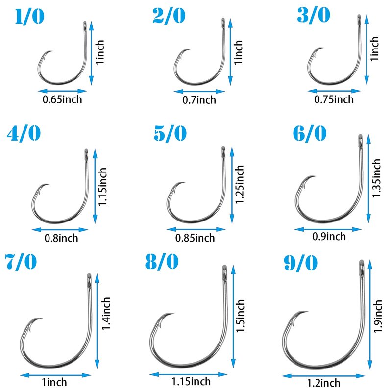 - Quantity: 50/150pcs fishing hooks for each size. Size: 1/0, 2/0, 3/0, 4/0, 5/0, 6/0, 7/0, 8/0, 9/0 you can choose