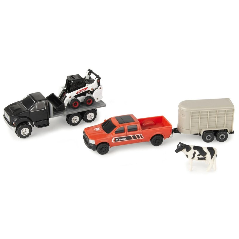 Playtime just got way more fun - introducing a five-piece Bobcat construction set by ERTL! This officially licensed Bobcat set includes a pickup truck, rollback, livestock trailer, Bobcat skid steer and a cow. This set's sturdy plastic construction is designed to stand up to play. Great for kids ages 3 years and older. Bring the construction site home with this 1/64 scale Bobcat construction set!