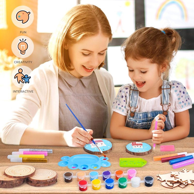- 【Comprehensive Craft Kit】 Let kids imagination run free with 10pcs wood slices, 9 wooden Ornaments, 17 paints, 10 glitter glues and 2400+ shiny diamonds and 2 gem stickers and so on.