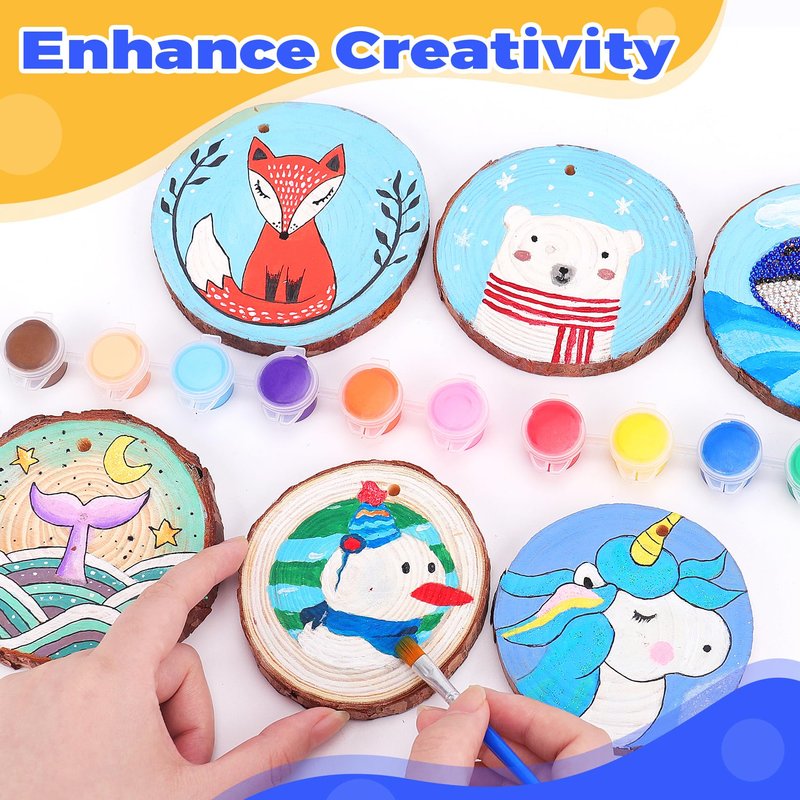 - 【Comprehensive Craft Kit】 Let kids imagination run free with 10pcs wood slices, 9 wooden Ornaments, 17 paints, 10 glitter glues and 2400+ shiny diamonds and 2 gem stickers and so on.