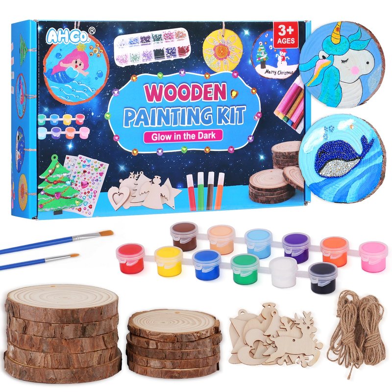 AHCo. Kids Wooden Painting Kit - Glow in The Dark, Crafts Girls Boys Ages 4-12, Creative Art Toys for 4 5 6 7 8 9 10 11 12 Year Old Kids, Wood Slice Craft Activities Kits