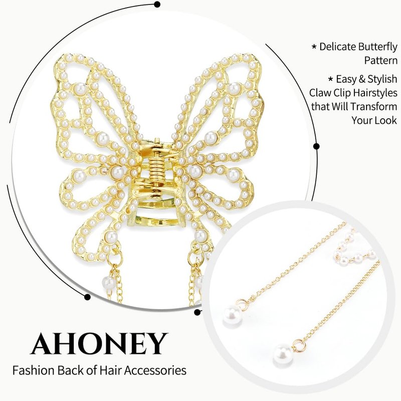 Ahoney 2Pcs Butterfly Clips for Hair, Butterfly Hair Claw Clips with Charms, Metal Fancy Hair Clips Hair Tassel Pearl Butterfly Hair Styling Accessories for Women Girls (Hollow Pearl butterfly)