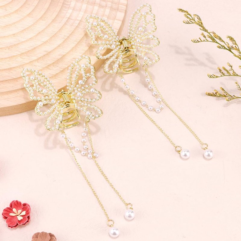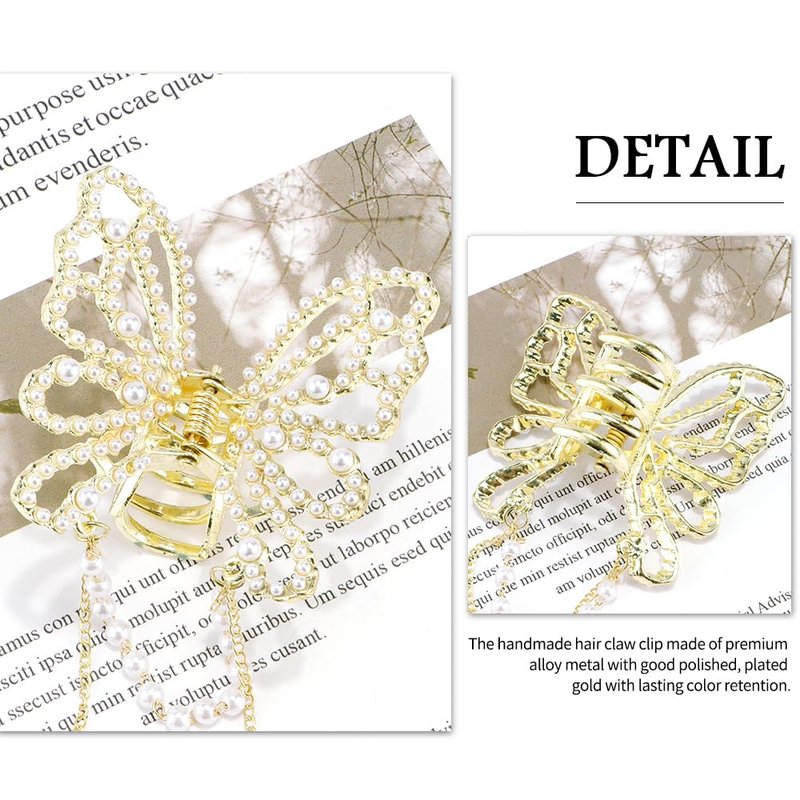 - 【STYLISH TASSELS】Fashion hair claw clip design in a hollow butterfly clip, pearl embellished it, combined with vivid long pearl tassels, which makes the metal butterfly claw clips more texture and delicate.