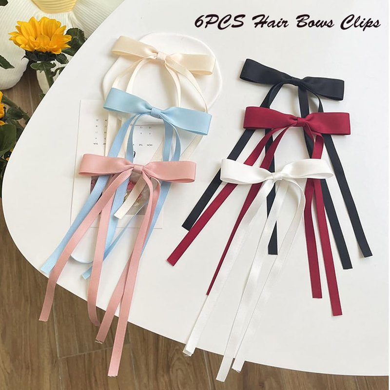 Ahoney 6pcs Satin Bow Hair Clips for Women Girls, Hair Bows Ribbons for Hair Bowknot Hair Clips with Long Tail, Coquette Long Hair Accessories Barrettes Hair Clips With Bow (Classic)