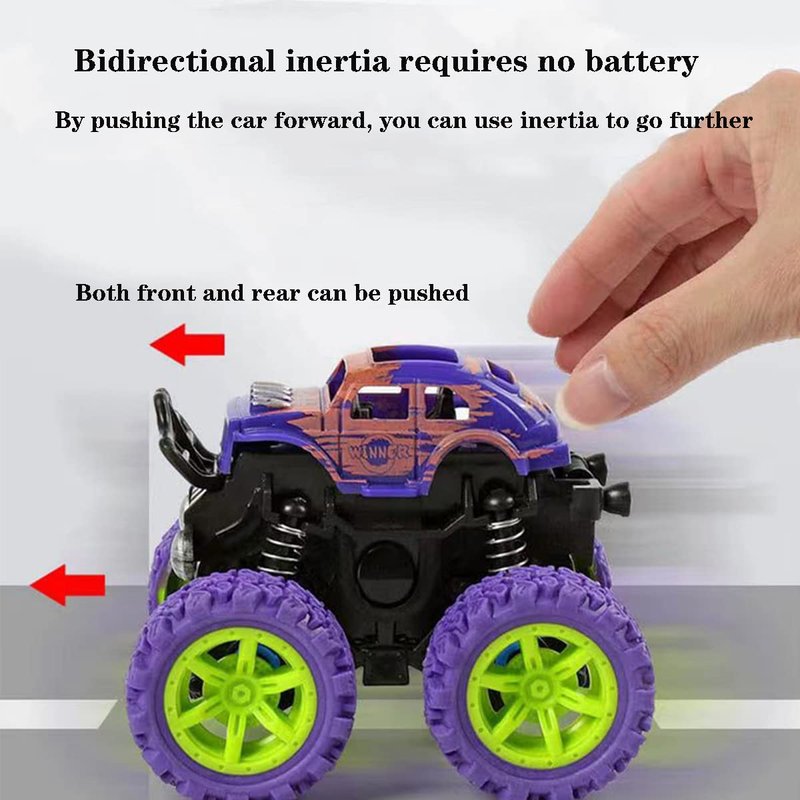 - [ATTRACTIVE COLORS] - The Stunt on-road vehicle comes in four different colors: Purple, red, orange and green. The four different colors of Toy monster trucks not only allow children to quickly identify, but also allow children to share the fun with their friends in indoor or outdoor games.