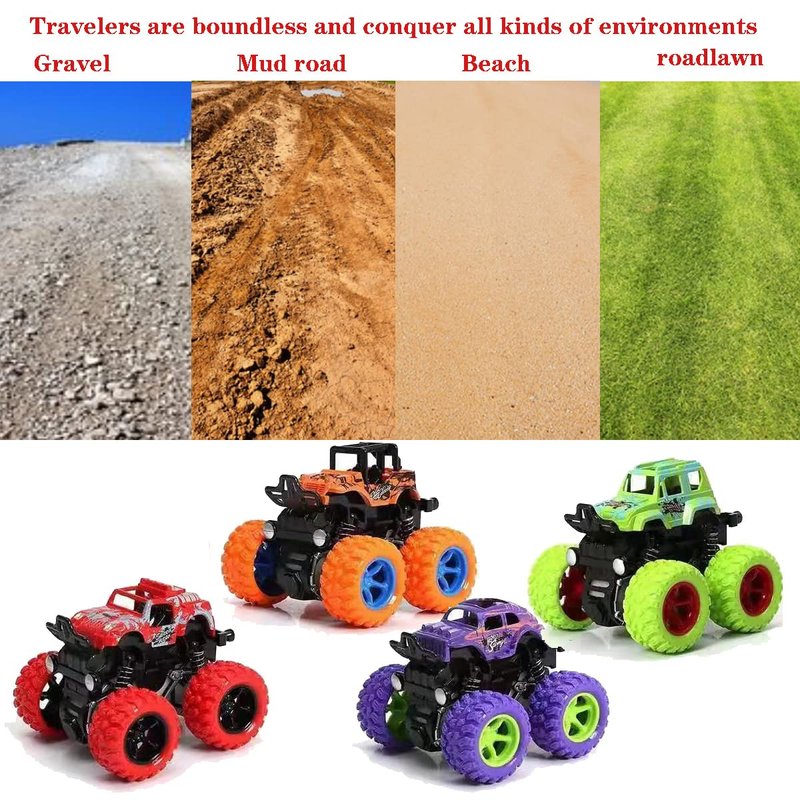 - [ATTRACTIVE COLORS] - The Stunt on-road vehicle comes in four different colors: Purple, red, orange and green. The four different colors of Toy monster trucks not only allow children to quickly identify, but also allow children to share the fun with their friends in indoor or outdoor games.