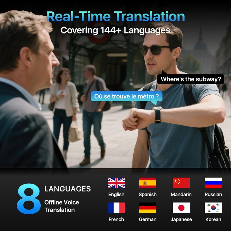 - Talk to the World From Your Wrist: Our AI smartwatch translates over 144 languages instantly, including the 8 most spoken ones. Travel made easy: ask for directions, order local food, or get through security fast—all with a simple lift of your wrist. Break down language barriers effortlessly.