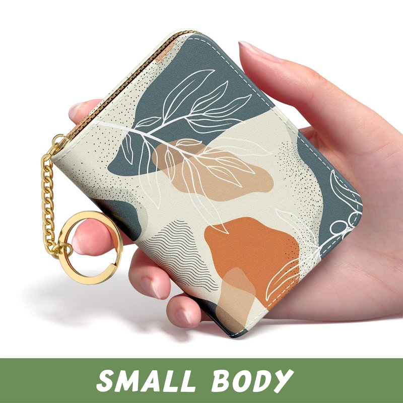 Aiawoxc Credit Card Holder, Small RFID Card Wallet Slim Leather Organizer Case with Zipper & Keychain, Abstract Boho Leaves