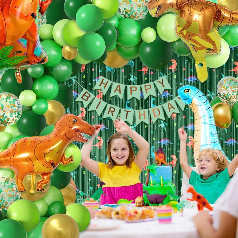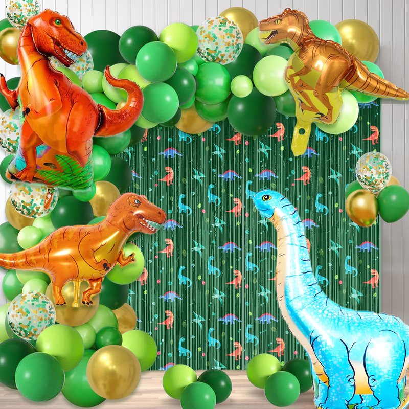 - Package Details: 95pcs Dinosaur Birthday themed balloons, 2pcs Dinosaur custom foil fringe curtain.