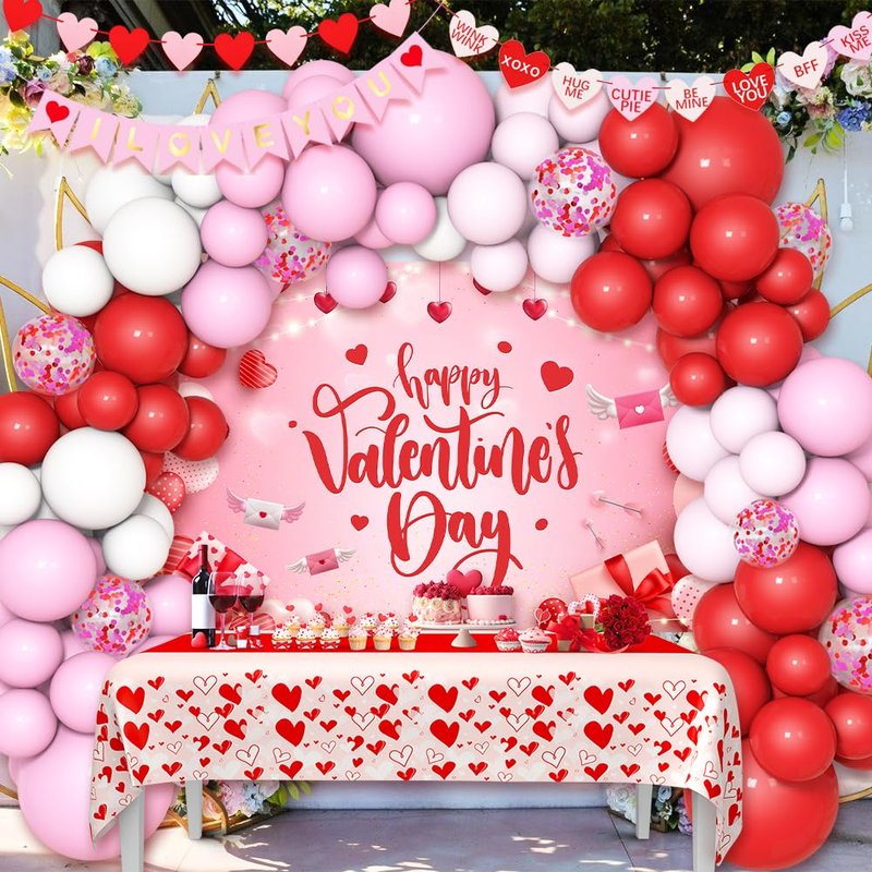 - Valentines Day Package: 170pcs red pink white and colorful confetti valentine's day balloons, 1pcs happy valentine's day backdrop and 1pcs pink and red heart tablecloth, 1pcs xoxo hug me wink cutie pie banner, 1pcs long sweetheart banner, and 1pcs I love you banner
