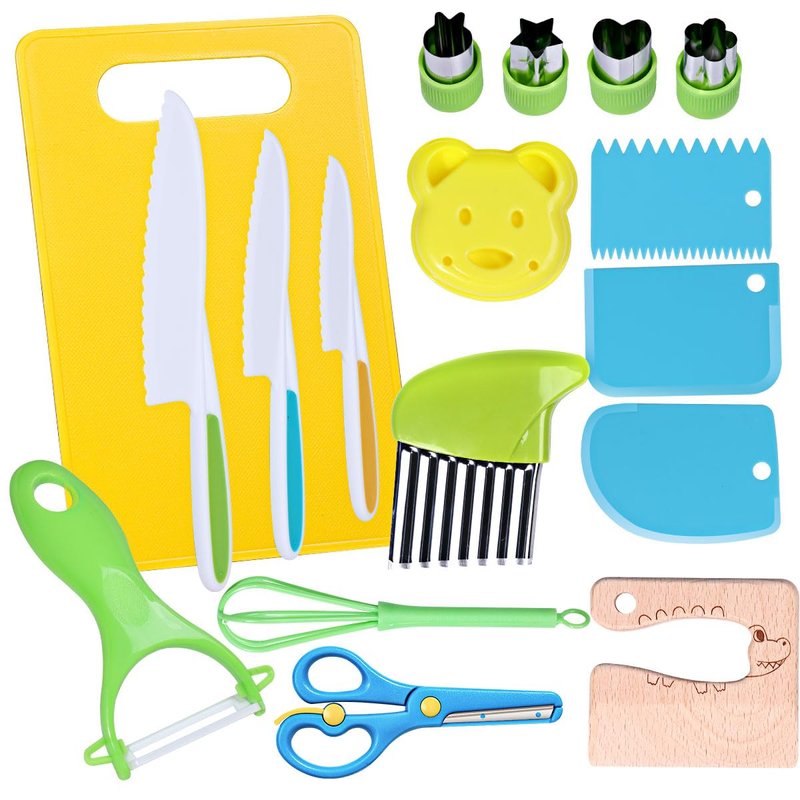 - Package Includes:The kids knifes set Package Includes 1 piece of wooden kids knife, 3 piece of cooking knife, 3 pieces serrated edges toddler knives, 1 pieces cutting board, 1 piece Y peeler, 4 pieces sandwich cutters, 1 piece crinkle cutter, 1 bear-shaped mold,1 x egg beater,1 x scissor,a variety of styles and uses of toddler kitchen tools can meet the needs of kids usage requirements.