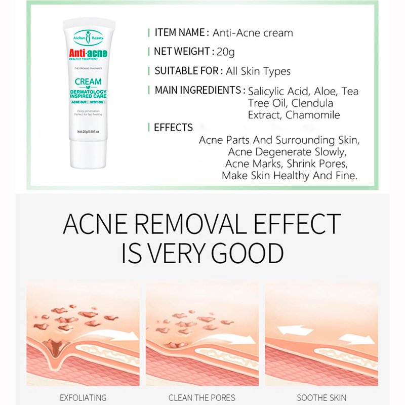 Anti - acne Cream This cream effectively treats pimples , comedones & acnes caused by oily skin or clogged pores due to dirt , improves acned areas and surrounding skin , gradually fades acnes , reduces acne scars and shrinks pores , leaving the skin healthy & delicate . Usage : After facial cleansing , apply a small amount of the Anti - acne Cream to your skin with pimples , comedones & acnes and the surrounding inflamed areas . Use daily morning and evening after facial cleansing . Suitable for : Men & ladies aged 16-40 , this problems including whelk , acne , speckle , acne with purulence , dark boils , scar of acne , red nose , folliculitis , pore helminth and acarid , prevent acne to spreading and reduce rebounding Applicability : For different types of skin , especially for acned skin . Storage : Store in a cool , dark , dry place . Keep out of reach of children . Avoid direct sunlight and accidental ingestion Attention : 1. People who are allergic to this product or have skin ulcers are not allowed to use it . Pregnant women and those during lactation should use it with caution . Children must use it under adult supervision . 2. For external use only . If skin becomes red , swollen , chapped or painful , discontinue use immediately .