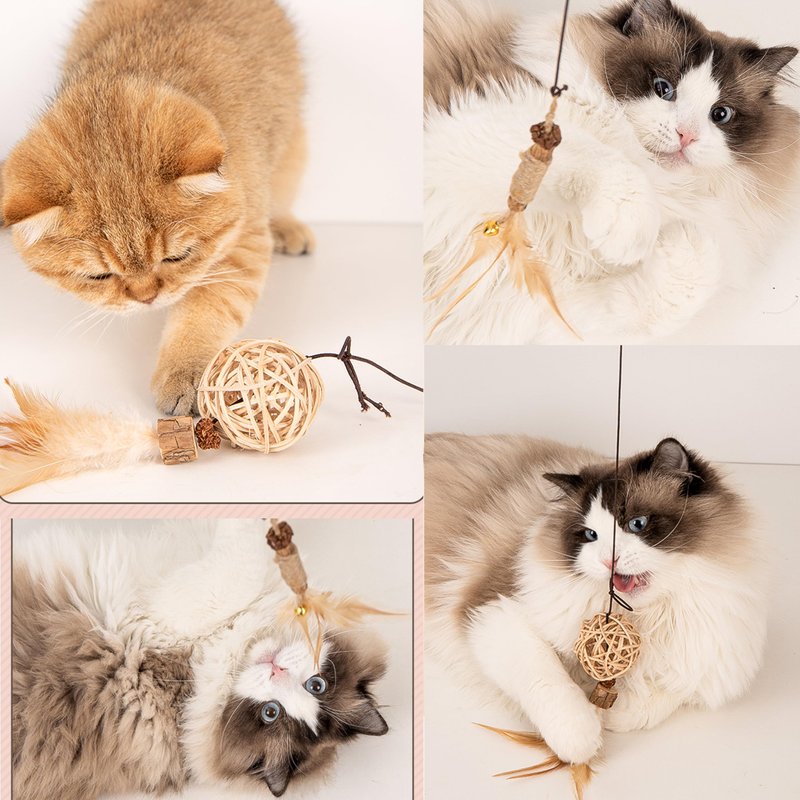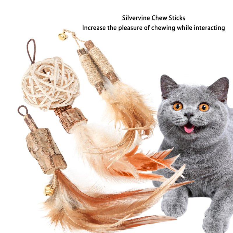 - Silvervine Feather Cat Wand Refills : Our cat wand replacements are made from natural silvervine, raffia, sisal rope and gall fruit.The gall fruit on the cat chew stick has a stronger taste and is more attractive to cats.While interacting with the cat, the cat can chew on toys. The natural sisal rope and raffia are bite resistant and help cats clean teeth.There are absolutely safe for cats to chew and bite.