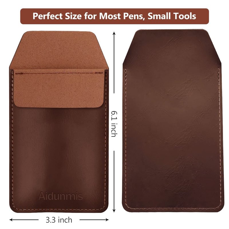 - Package: You will receive 2 pieces leather pen holder, one each in black and brown. They will not be disassembled, peeled or worn. You don't need to worry about quality issues. Each pen protective bag is measuring at 6.1 inches long, 3.3 inches wide, there is plenty of room for all of your tools. As a pen pocket protector is easy to install and remove, which can be well fixed.