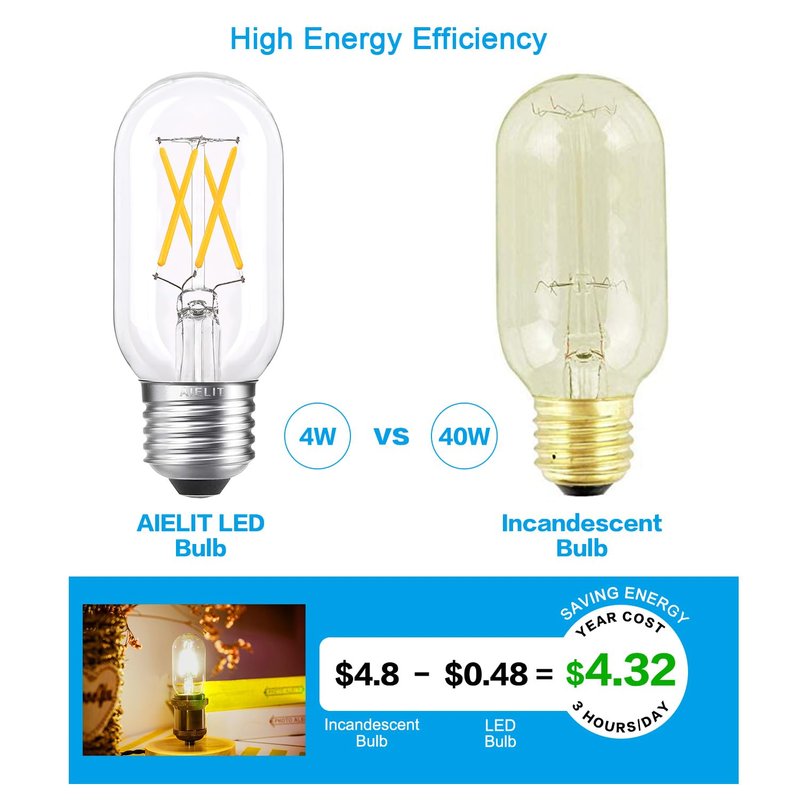 - 【Vintage Look & Energy Saving】This T14/T45 LED bulb features a classic Edison style as an old-fashioned 40W Edison bulb. Start saving today with these energy efficient T45 Edison LED Light Bulbs. 4 watts, equivalent to a 40-watt incandescent bulb, saves up to 90% of energy and reduces the frequency of bulb changes.