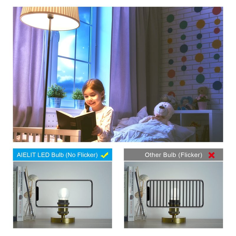 - 💡 NO FLICKER OR STROBE - Bright white glow, no mercury, no UV & IR, no dazzling, AIELIT 5000K globe filament bulb is clean and beautiful in appearance, brightness and color, perfectly creating a bright, healthy and cozy atmosphere for home, reducing eye strain and eliminating visual fatigue caused by the conventional lamp