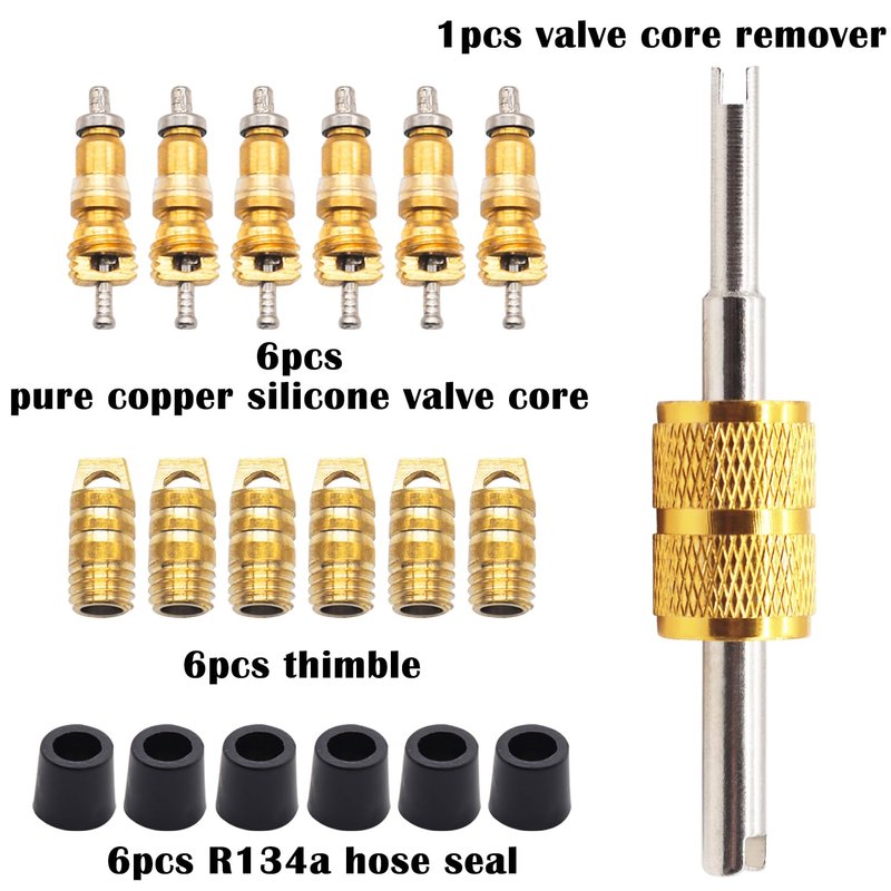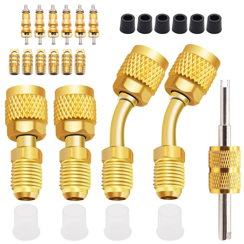 - Package Include: 2pcs 45 degree R410a adapter, 2pcs straight R410a adapter, 1pcs Valve Core Remover, 6pcs hose gaskets, 6pcs pure copper silicone valve core and 6pcs thimble.