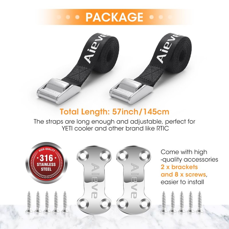 - Package: This cooler tie down kit for boat including 2 pack heavy duty nylon straps with cam buckles, 2 pack stainless steel brackets, and 8 screws. Trusted quality, strong enough and easy to use, an ideal choice to hold and tight cooler ice chest.