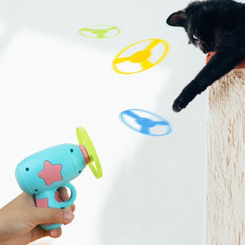 - Cat Teaser Toy: Just aim and launch flying discs, then cats will be driven by curiosity to chase and fetch them. This cat toy will stimulate your pets' instincts, and help them get rid of boredom, bringing them a good mood. It won't be like those automatic cat toys that have preset time to make cats exhausted, or be like those boring toys that can't draw cats' attention.
