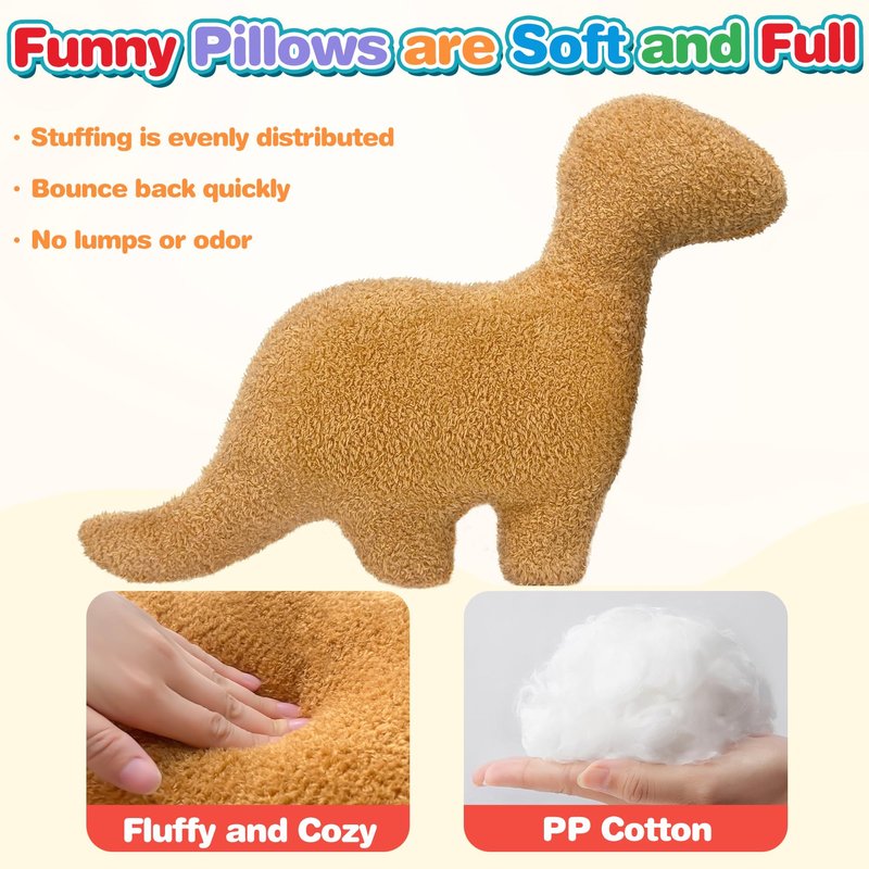 - Fun Throw Pillows Funny Decor: Dinosaur chicken nugget pillow is well made with excellent stitching. The neck, legs and pillow are full and not saggy or sparse of filling. Funny dinosaur stuffed animals make a great home decoration to throw on the bed or couch, novelty pillows is funny and a conversation starter.