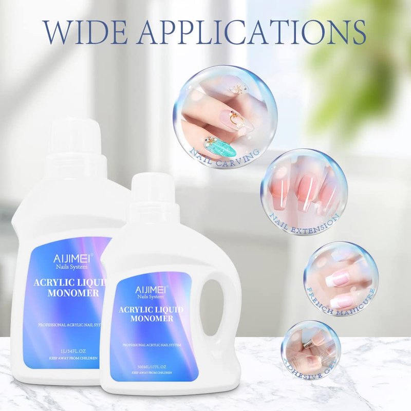AIJIMEI Acrylic liquid monomer is suitable for professional nail artists, Nail salons, Nail schools, Nail artists and personal and family use. Design any unique nails on different occasions or holidays according to your own ideas, And enjoy the fun of designing. Widely Compatibility: Monomer For Acrylic Nails Pairs well with other acrylic nails powders & liquids of other brands and products; Easy Application And Sculpting: Used acrylic nails powders & liquids to do nail extension,Nail carving or only being a clear overlay! FEATURES: 1.Acrylic liquid monomer is suitable for all nail types. 2.Monomer for acrylic nails is suitable for professional use and home use. 3. Acrylic nails powders & liquids dries quickly,Is stronger than other nail extensions, and easier to use. 4.Acrylic liquid monomer is applied externally and will not cause harm to your nails or body, So you can use acrylic powder and liquid with confidence. WARM TIPS: 1. Odor reminder: Acrylic liquid monomer is an advanced mixed monomer with low odor. To use monomer for acrylic nails, Please open the window or in an open place. 2.acrylic liquid monomer store in well-ventilated area. Keep container tightly closed. 3.keep out of reach of children. 4.Do not touch eyes when using acrylic liquid monomer. HOW TO USE? 1. Clean the nail surface. 2. Apply the base coat, cure by nail lamp. 3. Put a nail form on your nail. 4. Take enough acrylic liquid monomer to the cup. 5. Brush the acrylic powder with liquid monomer on the nail. 6. Apply it to the nail. Wait it dry. 7. Take off the nail form. 8. Trim the shape of your nails.Packing List: acrylic liquid monomer 500ml/17fl.oz x1pcs