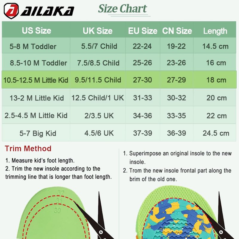 - PREMIUM COMFORTABLE: Ailaka uniquely children insoles are made of premium medical grade PU foam which can provide better cushioning and long-lasting support for every step. It is more soft and cozy than other material insoles. Anti-slip stripes on bottom keep insoles in place in boots, sports shoes, casual shoes.
