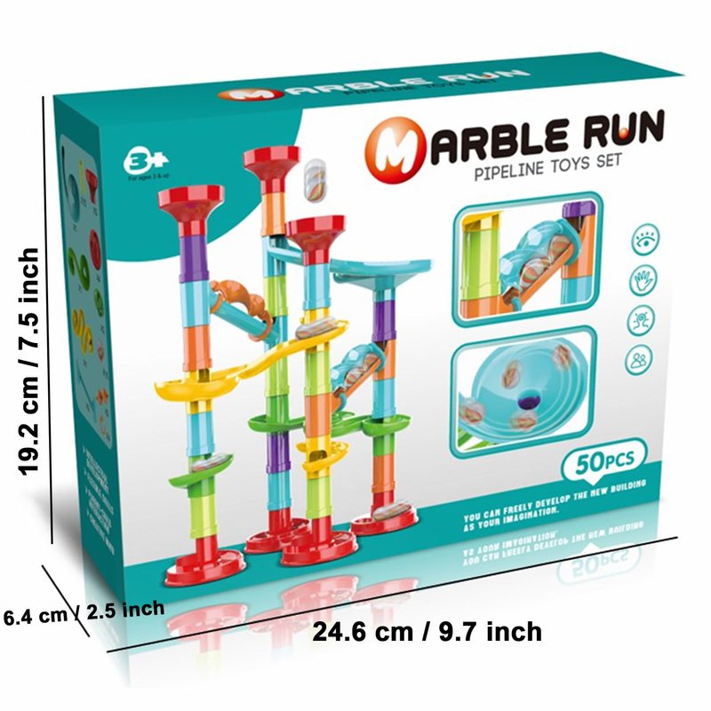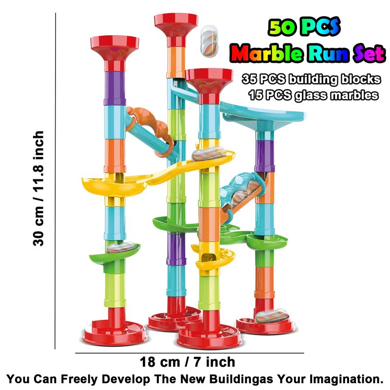 - 50 PCS Marble Run Premium Set: This marble run set contains 35 marble building pieces and 15 glass marbles. This marble running toy is translucent, allowing you to clearly see all the action of the marbles as they run along the track