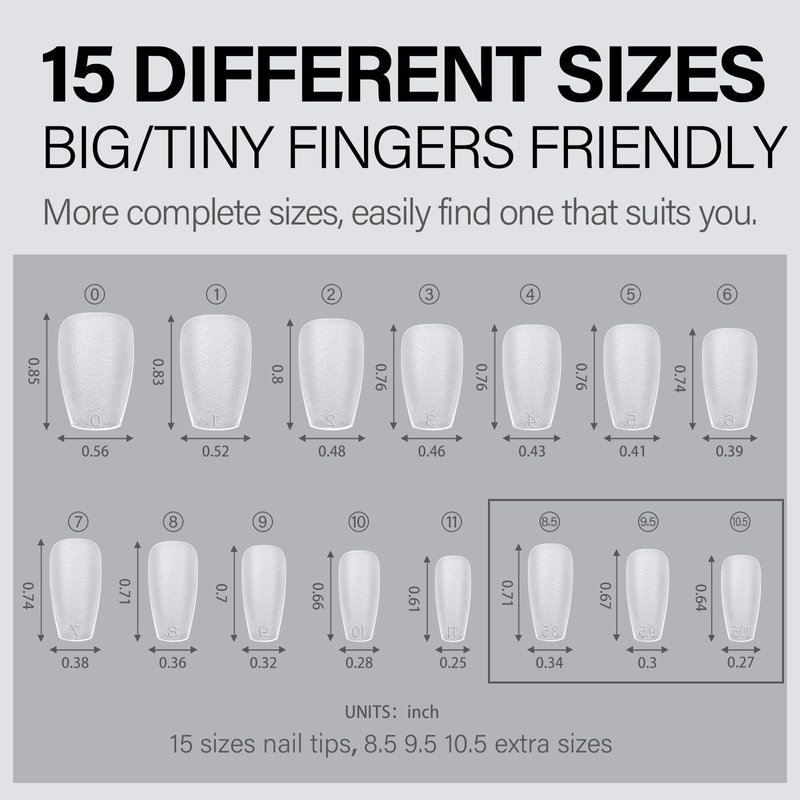 - MULTIPLE SIZE OPTIONS - Including 15 different sizes with each size 30pcs, totally 450pcs, our fake nail tips can provide you with more options. And there are numbers “ 0-14” marked on the fingertips, you can quickly find you sizes. The false nail tips are easy to operate, suitable for professional manicurist and even beginner. On weekends, you can invite some friends to DIY nail art at home together, which can save money and enhance relationship.