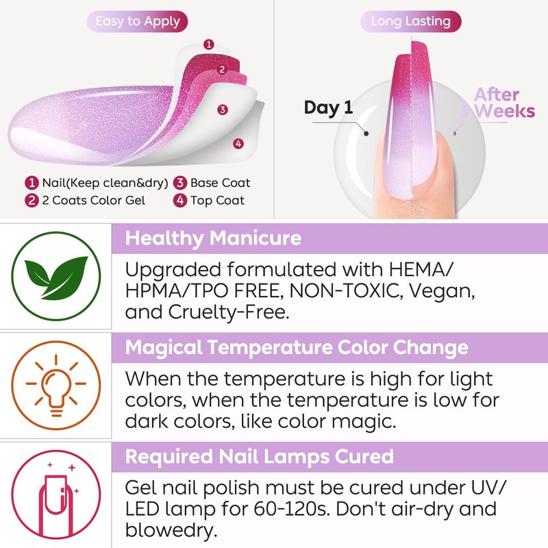 - UPGRADED HEMA-FREE Gel Nail: Natural Resin, Toxin Free, HEMA-Free, HPMA-Free, TPO-Free formula of Chameleon Nail Polish Gel for nail art make it more gentle to apply to your nails safer and healthier. It is normal for color nail polish gel to remain sticky after curing, which will make a better adhesion between gel layers. The top coat gel would seal it all in for better nail performance.