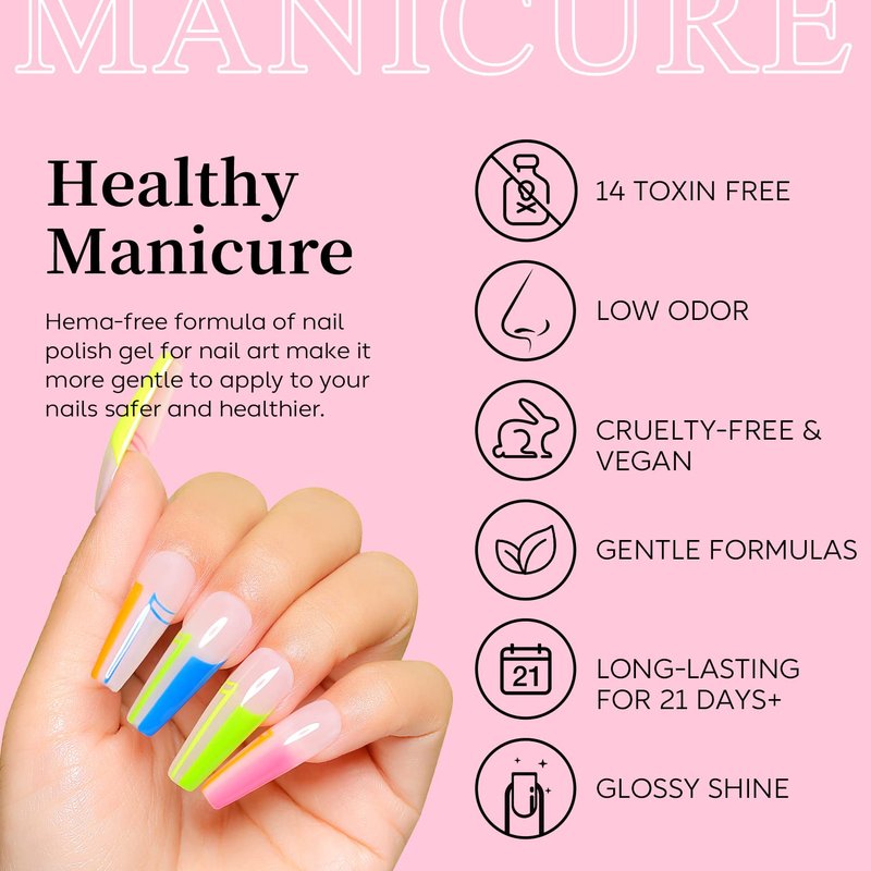 - UPGRADED HEMA-FREE Gel Nail: Natural Resin, Toxin Free, HEMA-Free, HPMA-Free, TPO-Free formula of nail polish gel for nail art make it more gentle to apply to your nails safer and healthier. It is normal for color nail polish gel to remain sticky after curing, which will make a better adhesion between gel layers. The top coat gel would seal it all in for better nail performance.