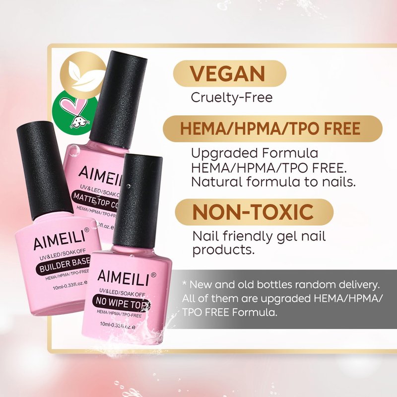 - VEGAN & CRUELTY-FREE: AIMEILI gel nail polish products are vegan, cruelty-free, environmentally friendly and reliable as 90% of the raw materials are produced in USA, Europe.