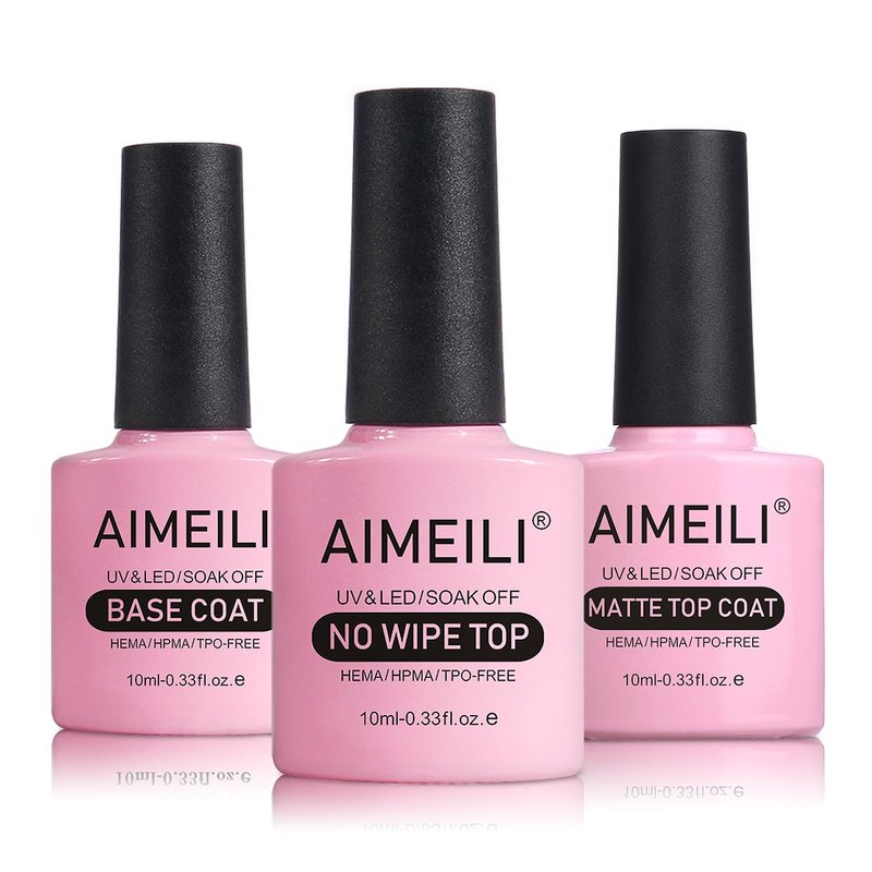 AIMEILI Soak Off U V LED Gel Nail Polish - Base Coat, Matte Top and No Wipe Top Coat Kit Set 10ML