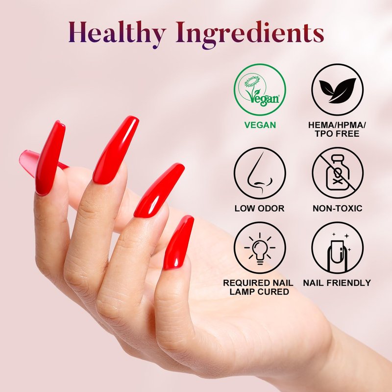 - UPGRADED HEMA-FREE Gel Nail: Natural Resin, Toxin Free, HEMA-Free, HPMA-Free, TPO-Free formula of nail polish gel for nail art make it more gentle to apply to your nails safer and healthier. It is normal for color nail polish gel to remain sticky after curing, which will make a better adhesion between gel layers. The top coat gel would seal it all in for better nail performance.