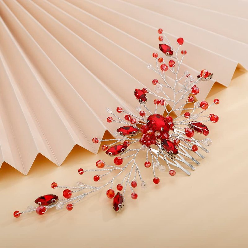 Aimimier Bridal Red Crystal Hair Comb Ruby Hair Gems Silver Headband Prom Party Festival Wedding Hair Accessories for Women and Girls(Red)
