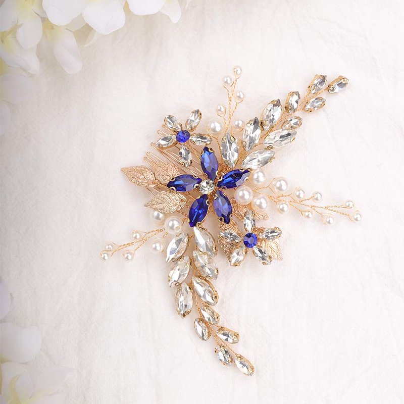 Aimimier Bridal Sapphire Crystal Hair Comb Pearl Blue Crystal Leaf Marquise Hair Piece Prom Party Festival Wedding Hair Accessories for Women and Girls (Gold)