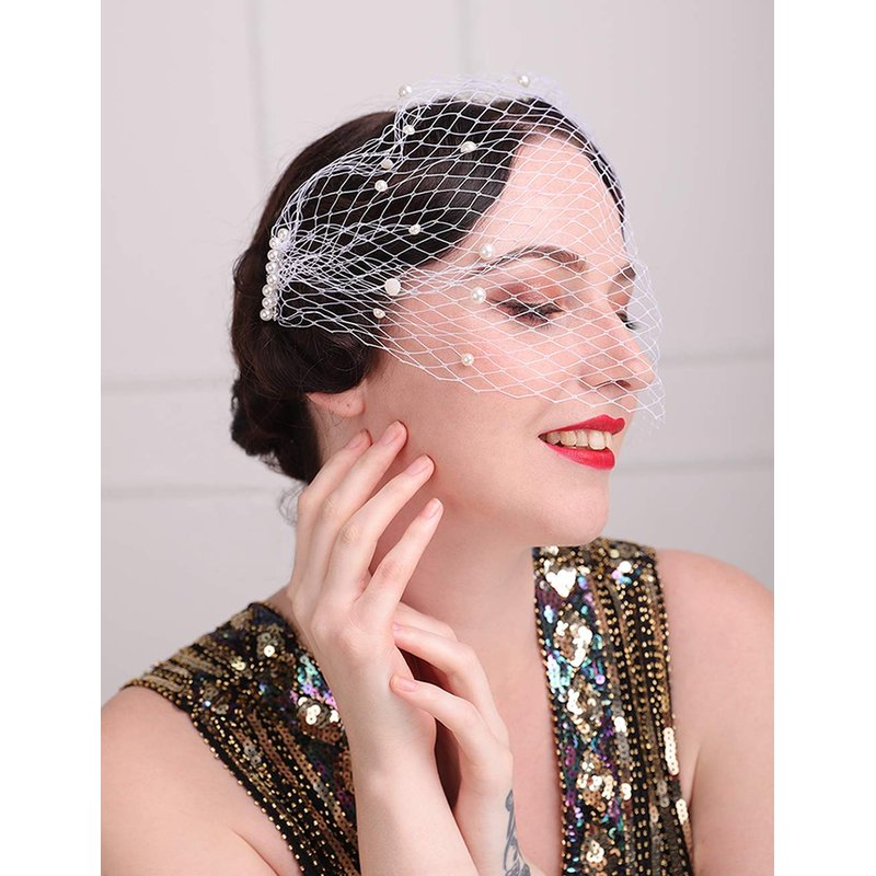 Aimimier Bridal Short Veil with Pearl Comb White Single-layered Birdcage Veil for Wedding (White)