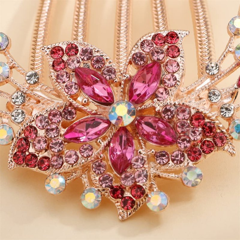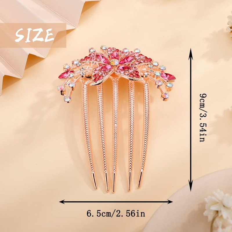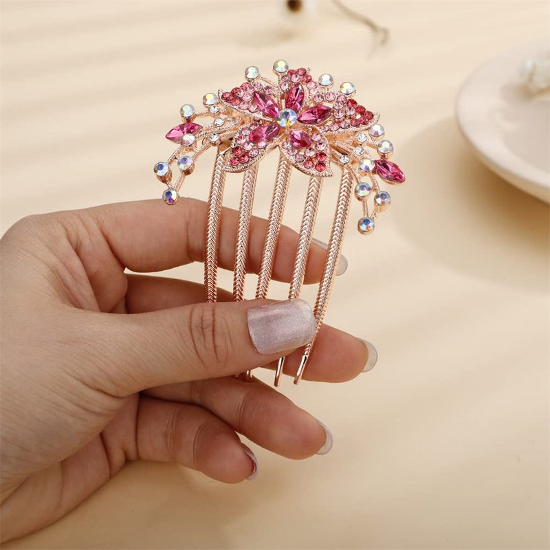 Aimimier Flower Crystal French Hair Comb Luxury Rhinestone Gem Side Combs Long Teeth Hair Pins Decorative Hair Accessories for Women Girls(Rose red)